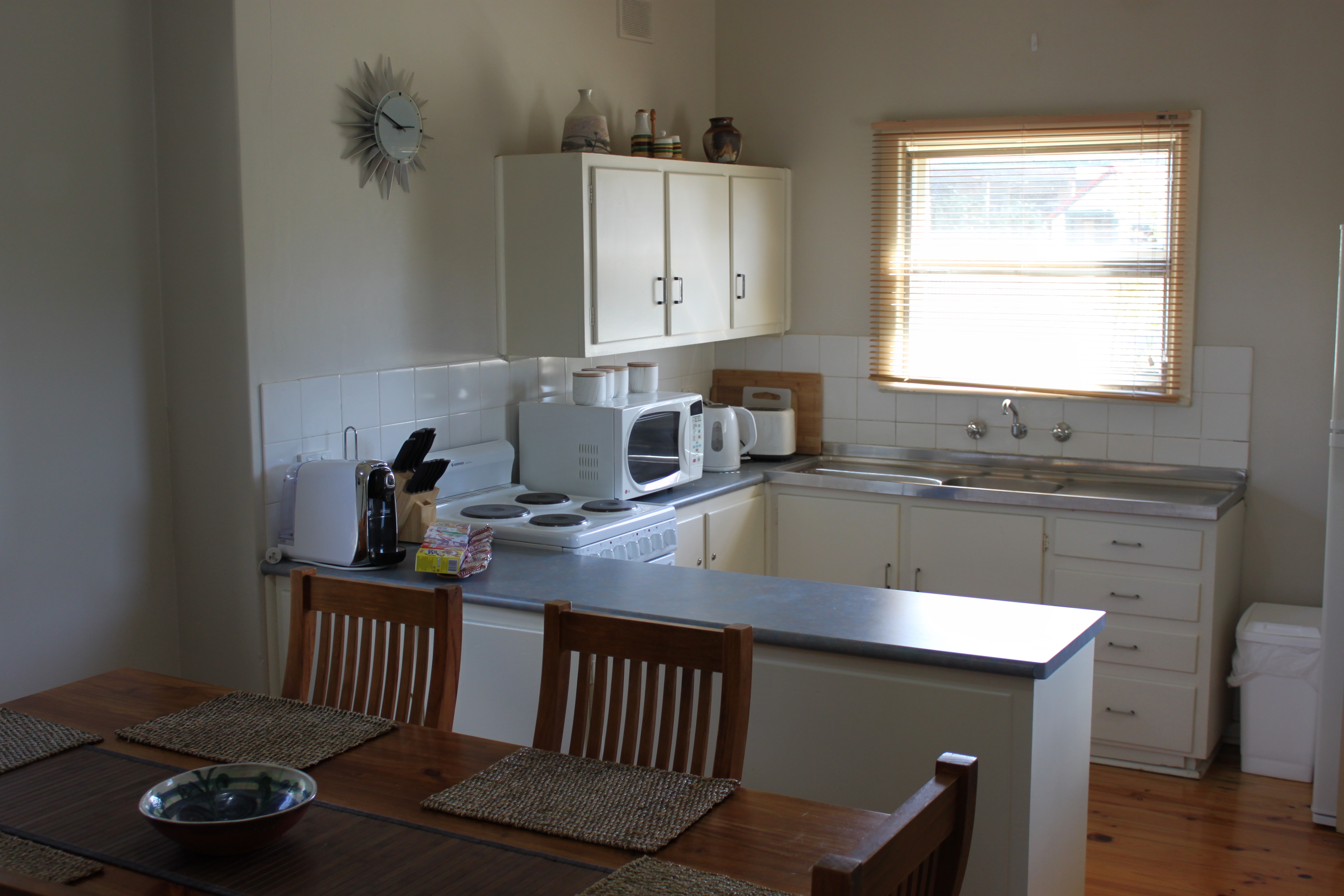 A lovely light filled living area, with R/C air conditioning greets you as you walk in the front door.  This area extends to a neat and tidy dining area and kitchen.