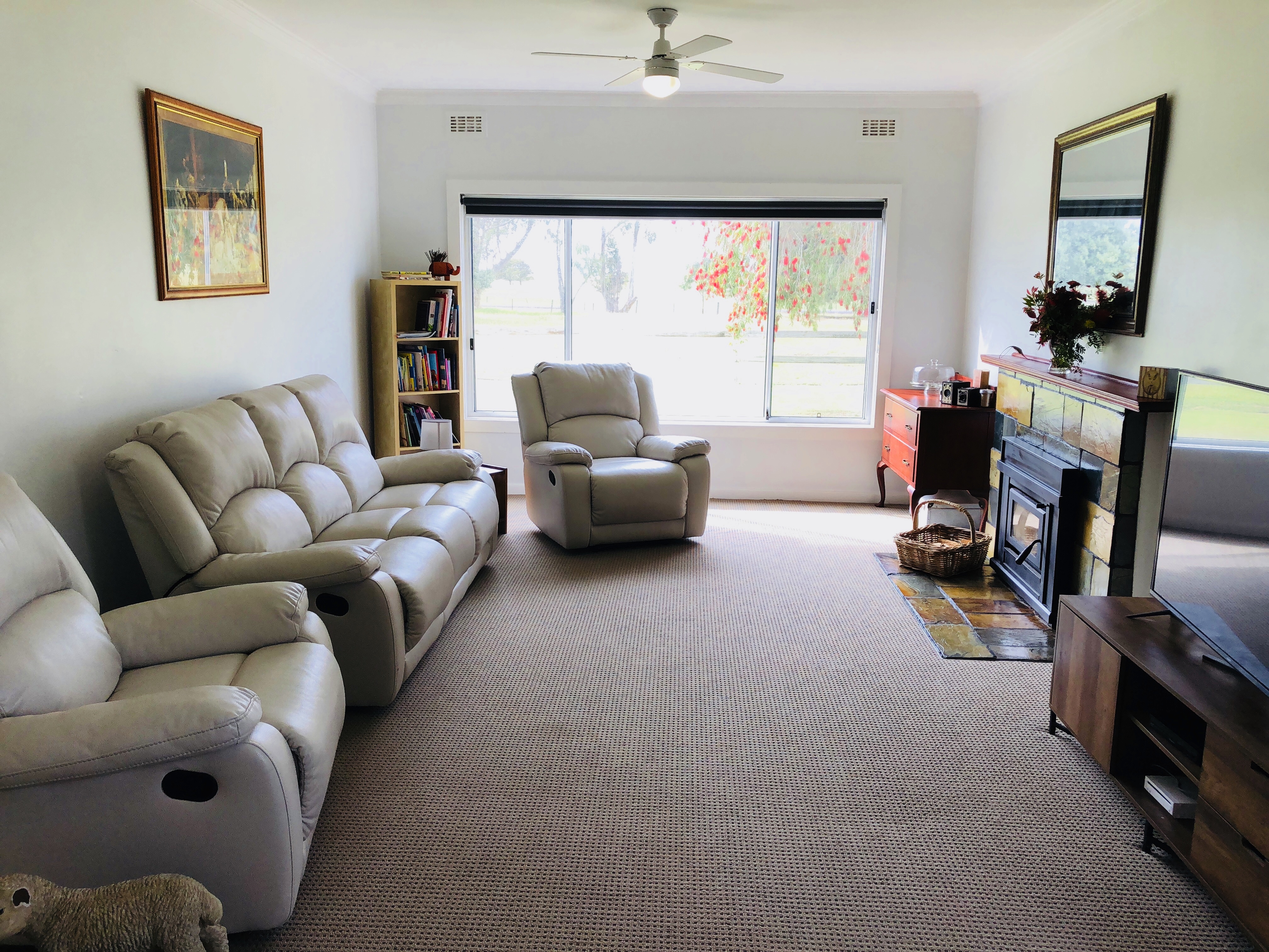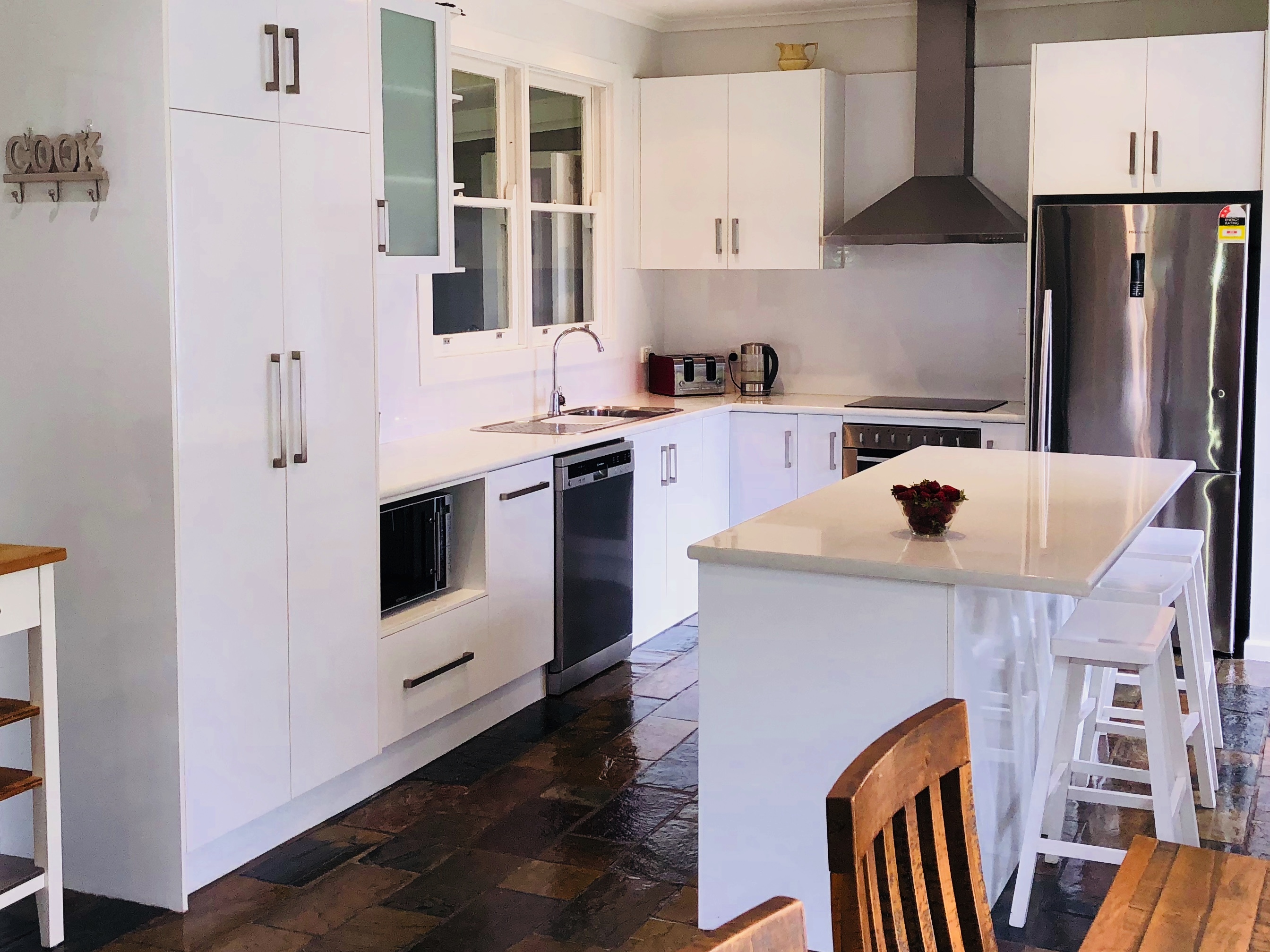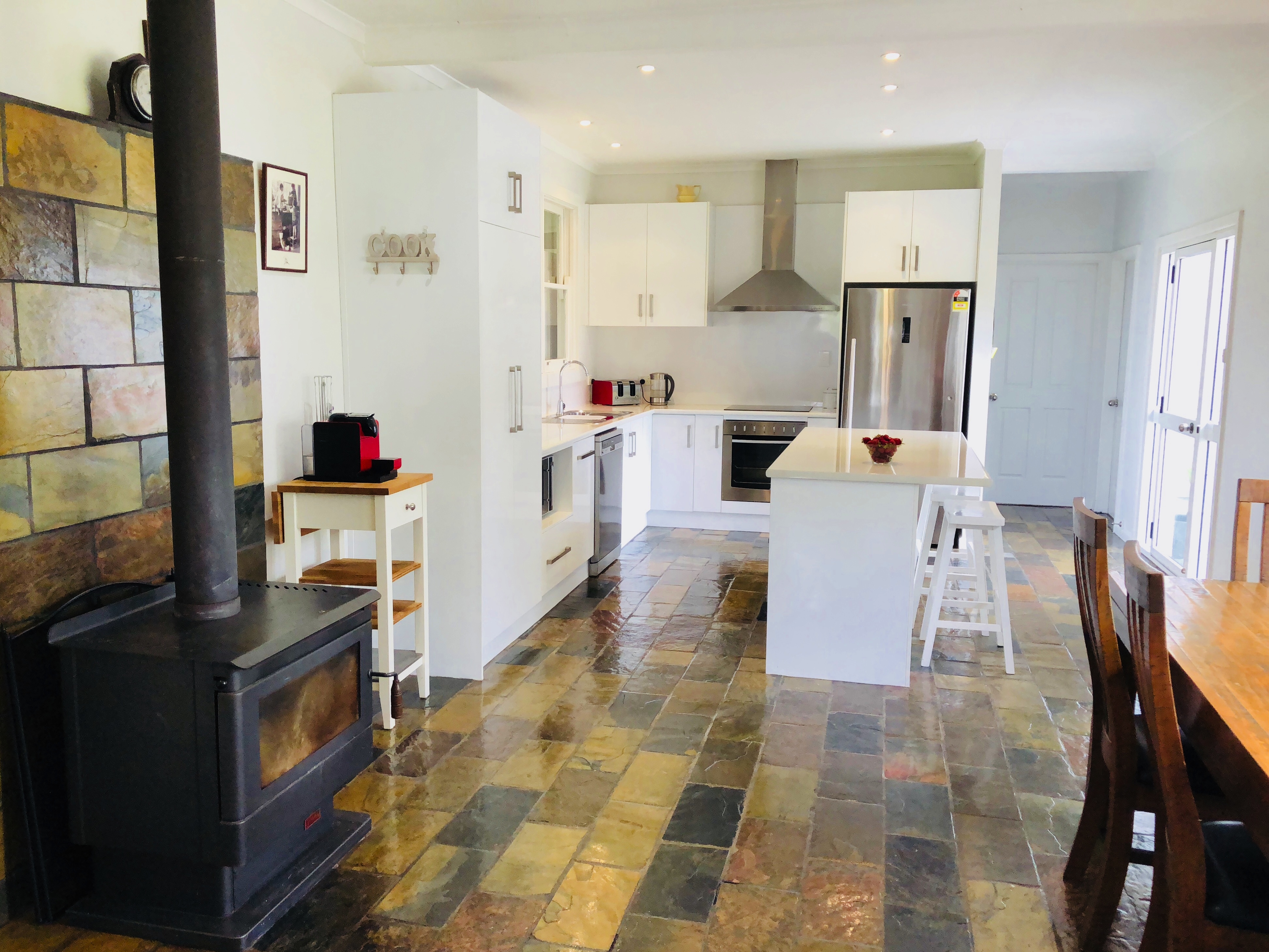 The home offers four bedrooms, three with built in robes and all with ceiling fans. The kitchen / dining area is contemporary featuring white cabinetry, slate flooring, dishwasher, stainless steel range hood, electric oven and cooktop and double sink. This ‘hub’of the home is bright and airy with natural light from large windows which look out over the front patio and scenic paddocks.