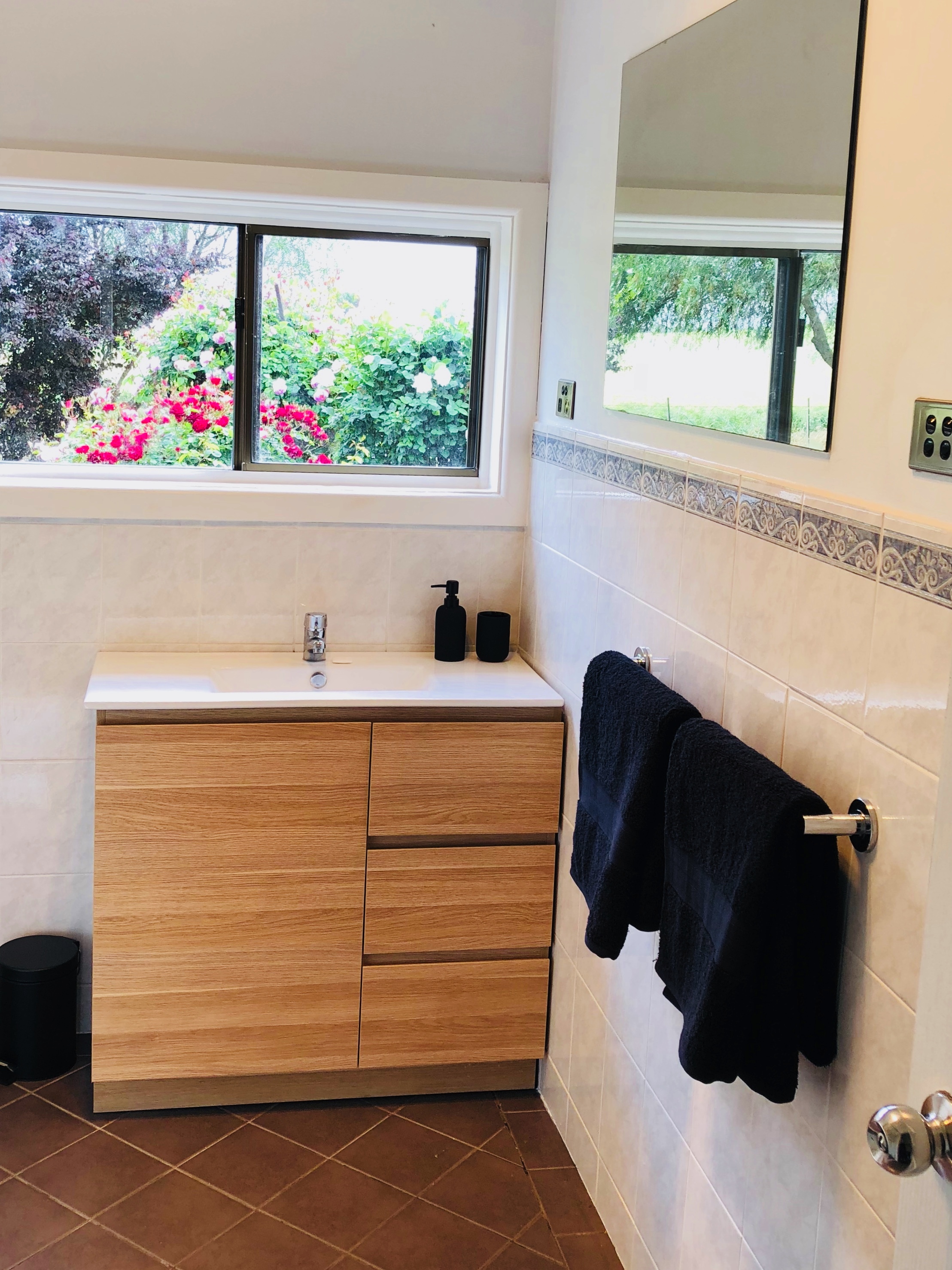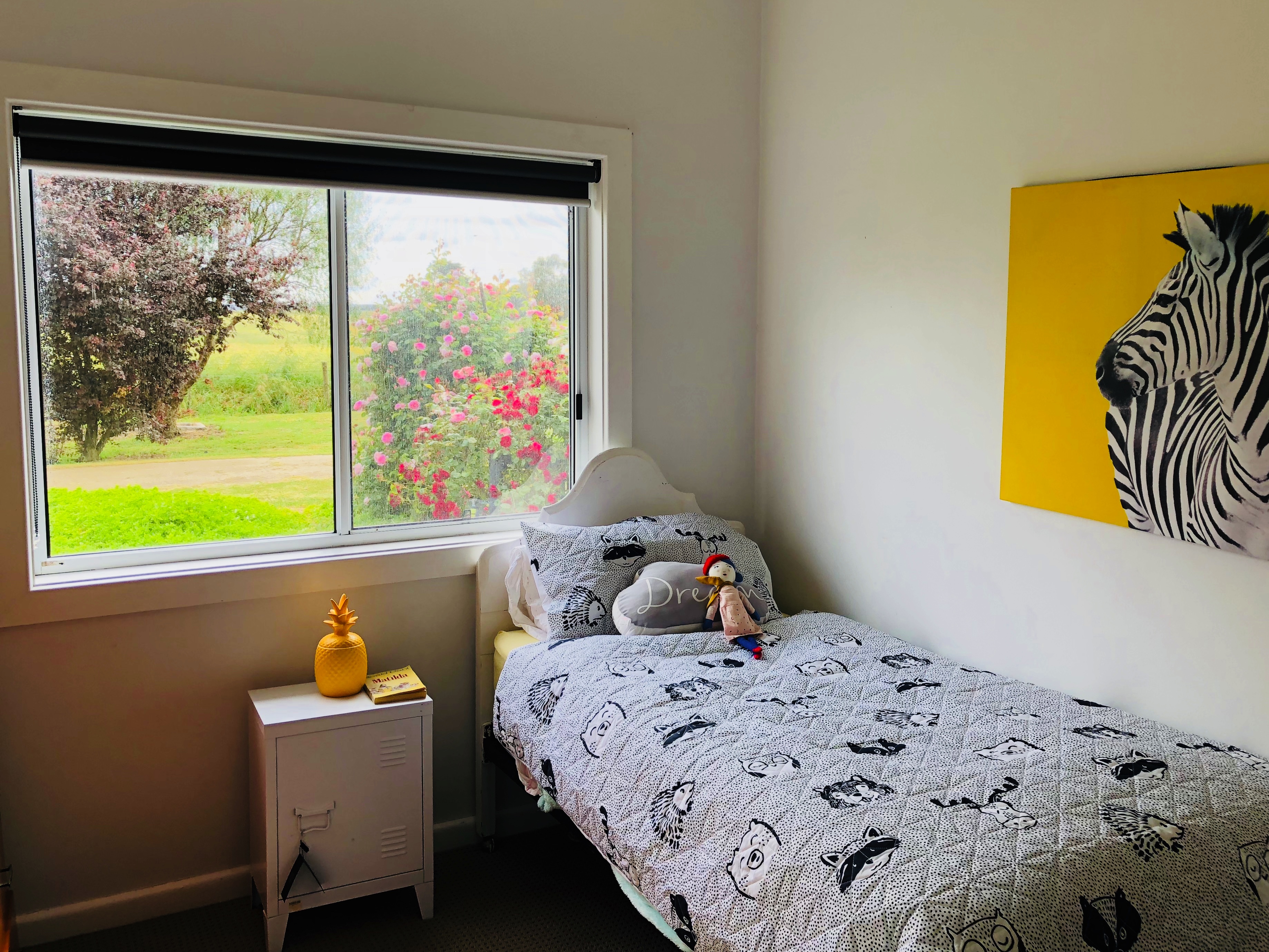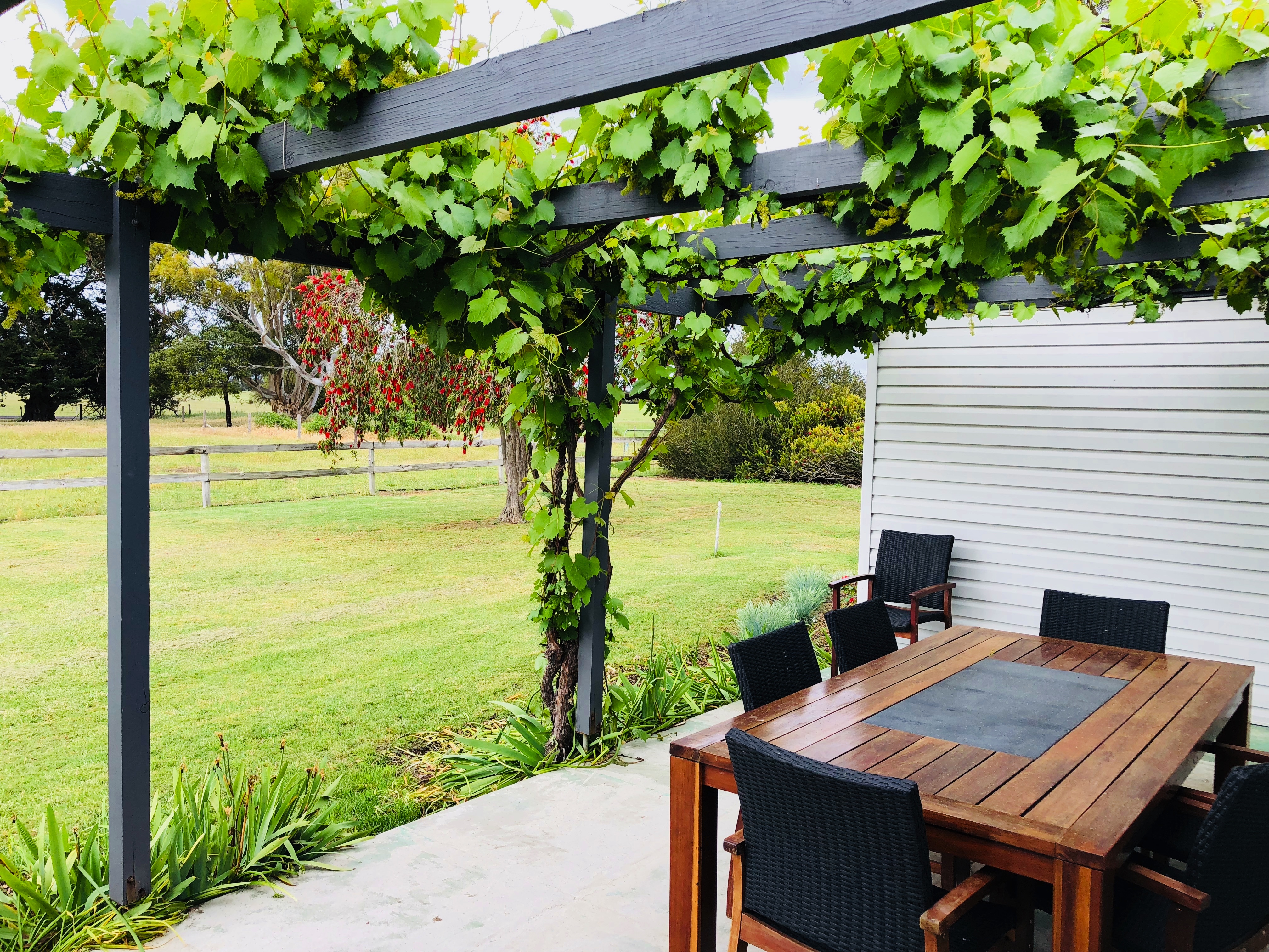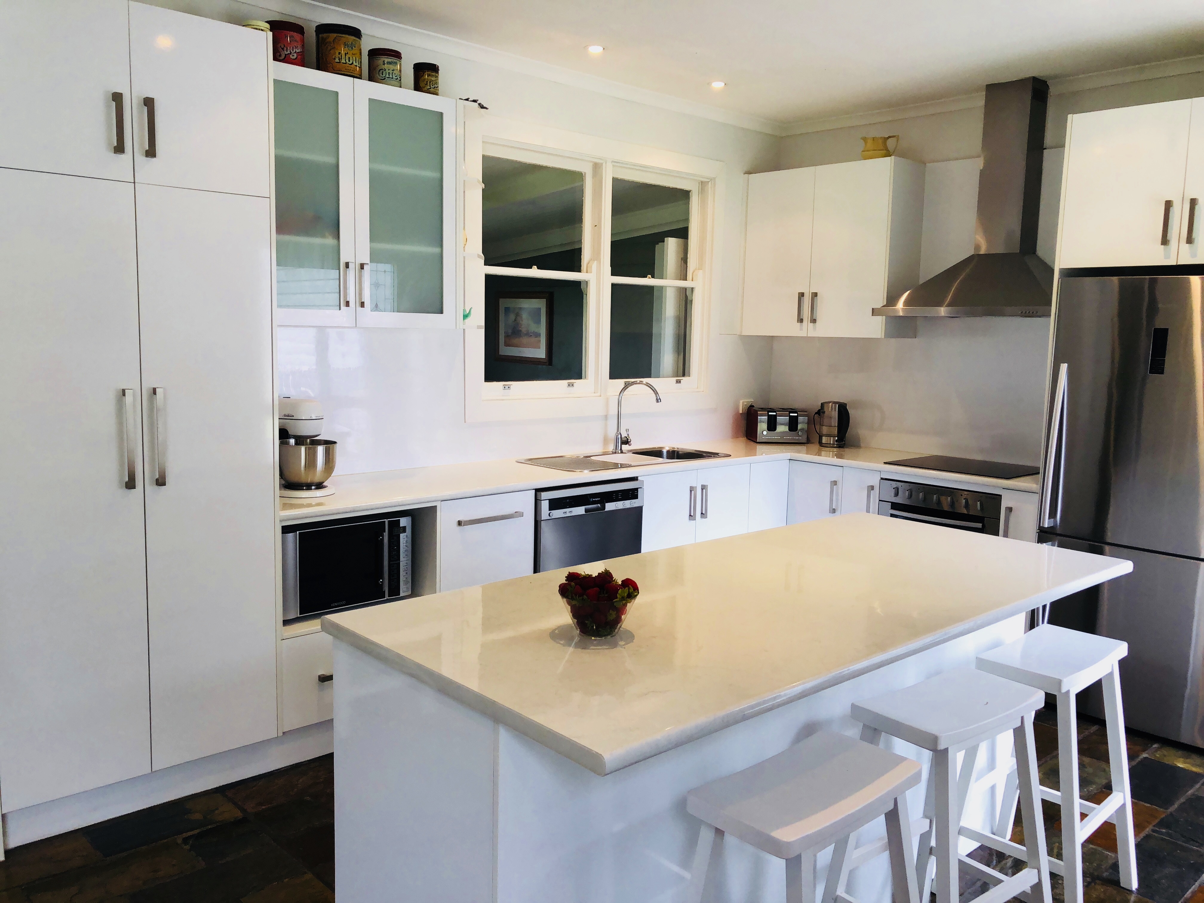 The home offers four bedrooms, three with built in robes and all with ceiling fans. The kitchen / dining area is contemporary featuring white cabinetry, slate flooring, dishwasher, stainless steel range hood, electric oven and cooktop and double sink. This ‘hub’of the home is bright and airy with natural light from large windows which look out over the front patio and scenic paddocks.